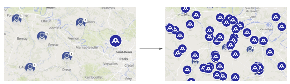 Le cluster est une sorte d'aimant qui regroupe les points autour de lui en fonction d'un rayon défini et du niveau de zoom (que vous pouvez paramétrer) afin de garantir une bonne lisibilité de la carte.