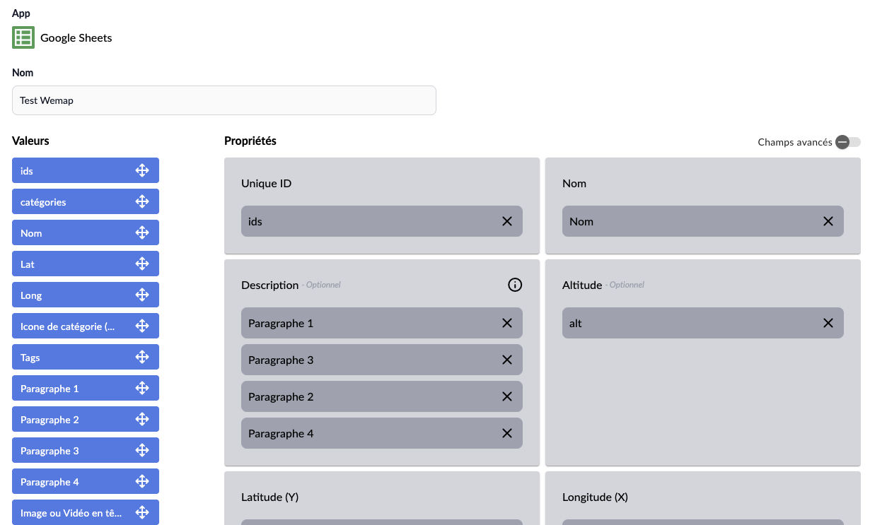 5. Procédez au mapping en associant au minimum les 3 champs obligatoires (ID, nom, adresse / coordonnées)
