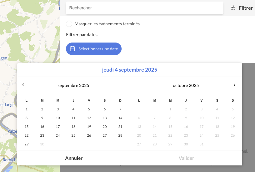 Le filtre "Calendrier" vous permet de borner vos recherches aux dates de votre événement ou d'afficher tous les événements prévus aux dates que vous renseignez.