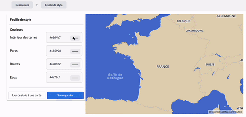 La feuille de style vous permet de personnaliser les couleurs du fond de carte (eau, terres, etc.) afin de les adapter à votre charte graphique, à la page d’intégration ou à un événement particulier. »