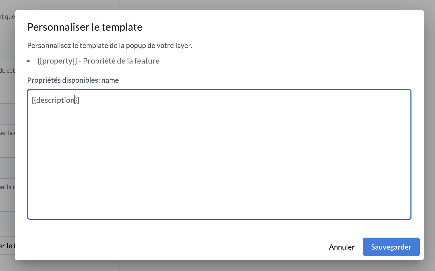 Ex : si la propriété "template_data" correspond à "description": "test", vous devez renseigner {{description}}