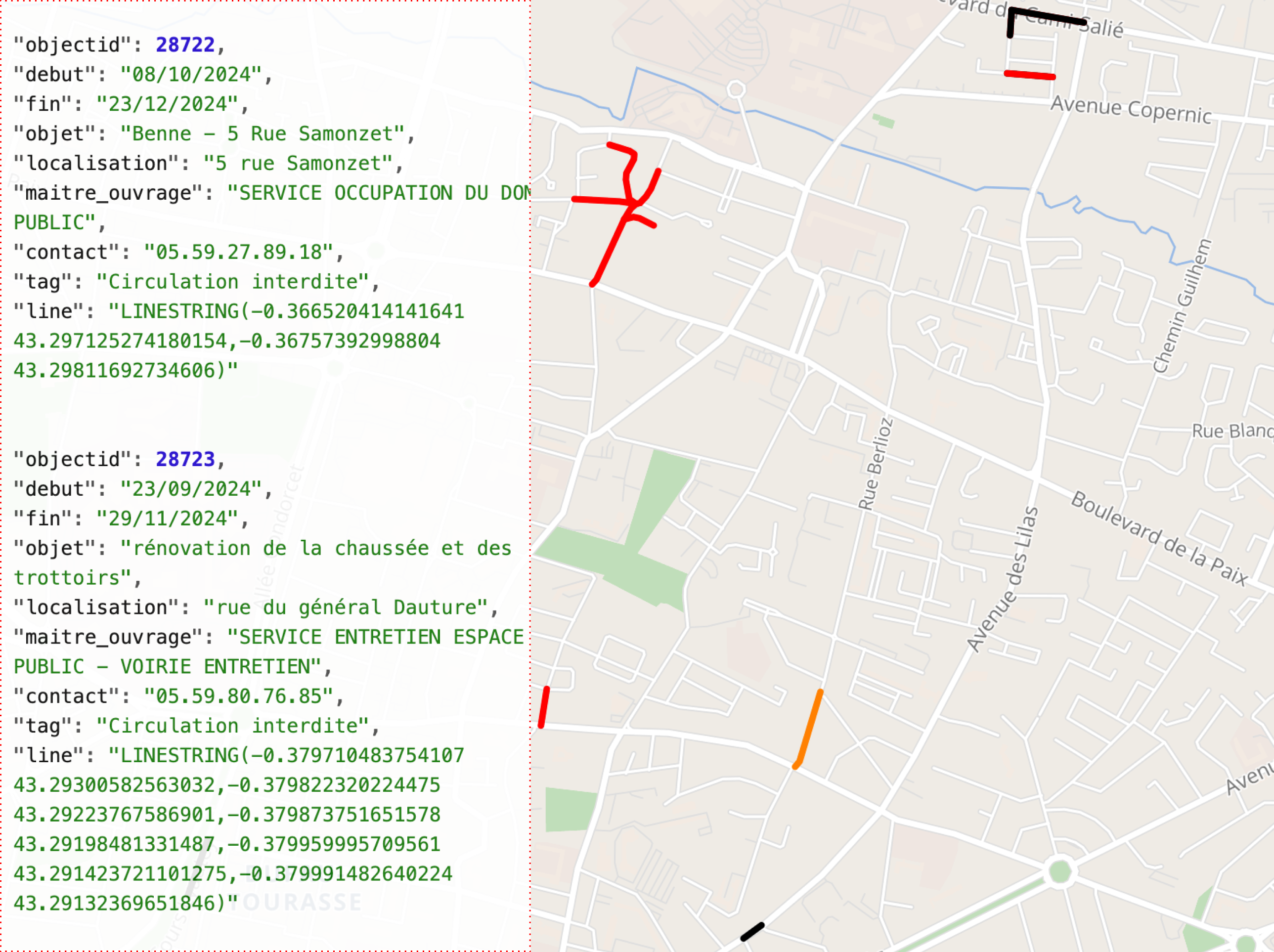 Voici quelques exemples de réalisations, avec un extrait de la structure de la donnée utilisée à gauche et un aperçu du rendu sur la carte à droite.