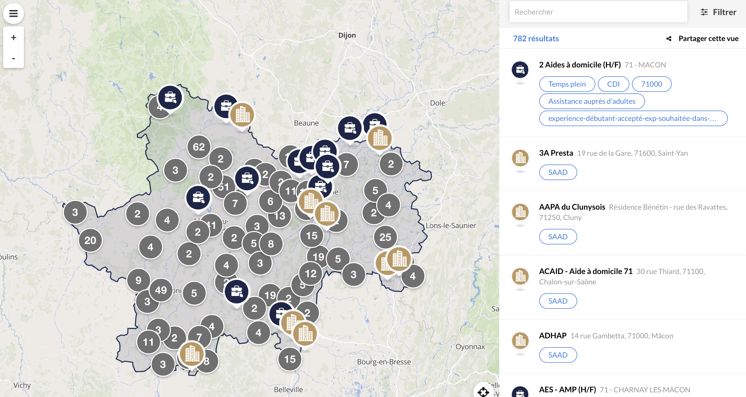 Cette carte interactive des emplois en Saône-et-Loire vous offre une vue complète et détaillée des opportunités professionnelles disponibles :