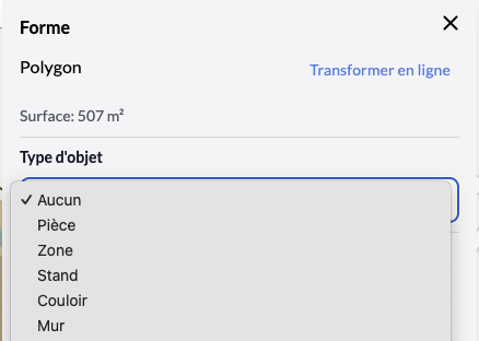 Lorsque vous ajoutez ou dessinez un objet sur une venue, vous pouvez lui associer un type d'objet, des propriétés, un level...