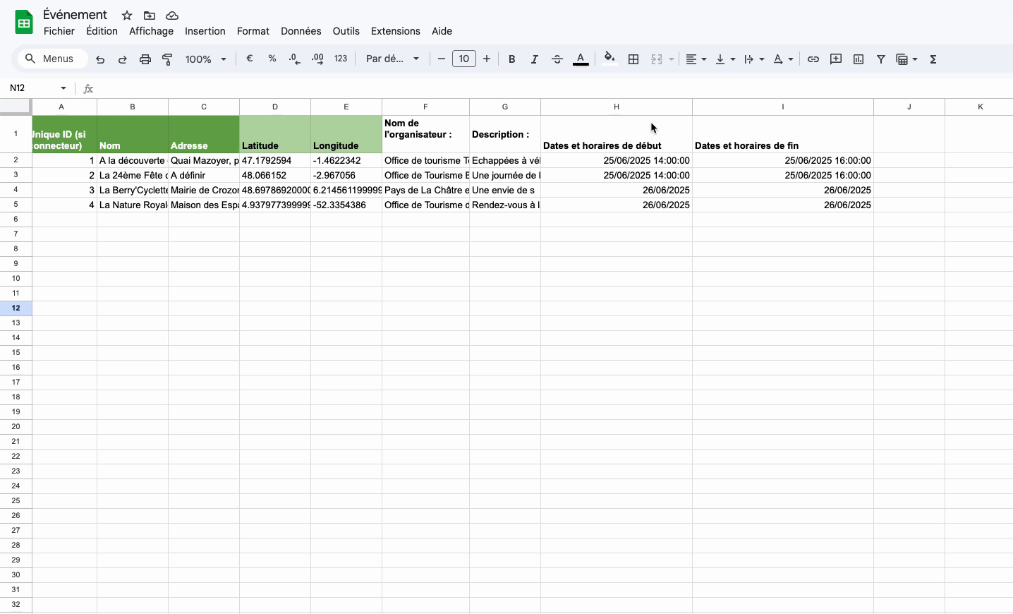 Lorsque vous créez un événement depuis un fichier Excel ou Google Sheets, celui-ci doit contenir des informations de dates / horaires au format ISO (mode de représentation numérique de la date et de l'heure répondant à une norme internationale).